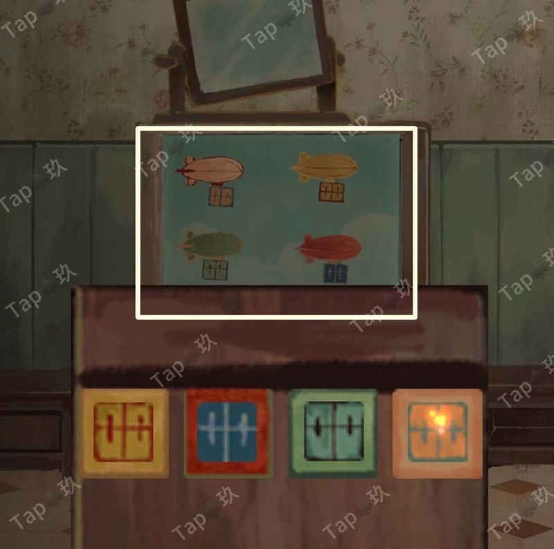 点击抽屉,按照电视图案提示(飞机颜色与掉落箱子对应抽屉锁边框和内部颜色),调整至所示状态,获取。