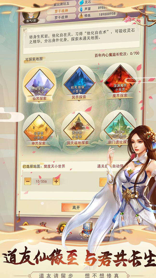 最后来到仙缘界面,这里是刷怪获取资源的主要场所。各地图中的怪物均会随机掉落灵石、声望、丹药、装备及各类材料。当灵石不足时,可通过反复刷取同一张地图来快速积累资金。修为达到出窍期后,可在该界面学习元婴出窍决,实现自动挂机战斗。该技能分为两种版本:一种为元婴出窍秘诀,售价1000灵石,提供基础挂机功能;另一种为元婴出窍真诀,定价约100元人民币,具备加速挂机效果,适合追求效率的玩家选用。
