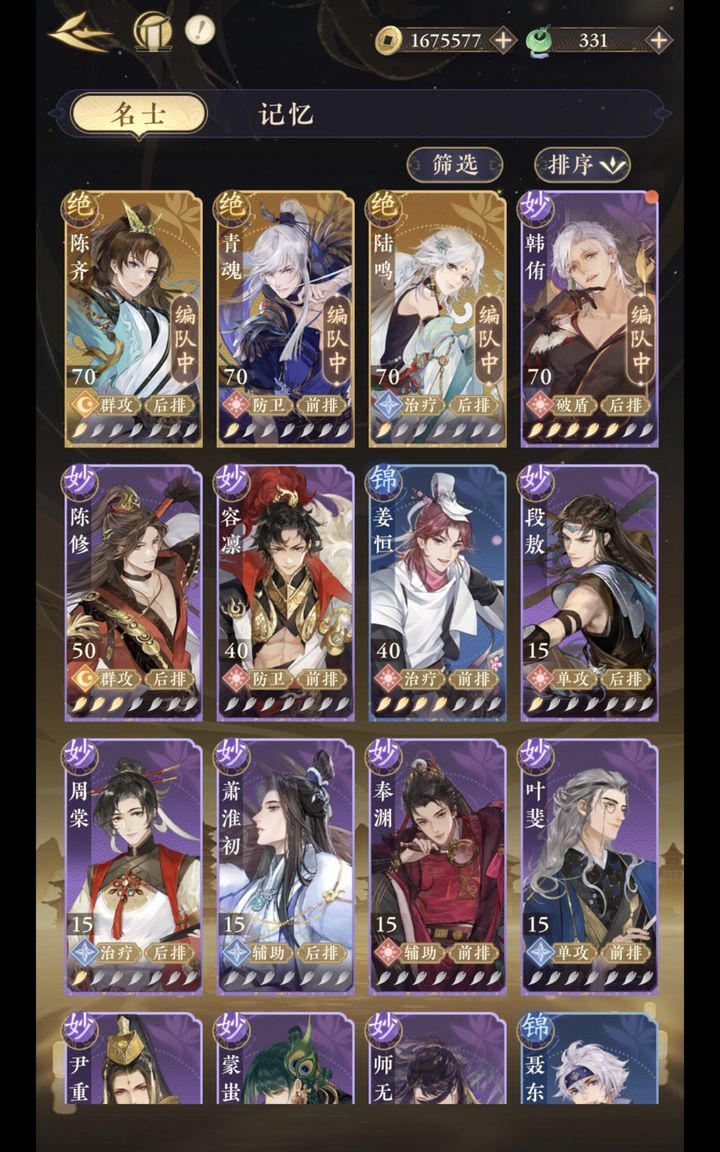 言归正传,我的队伍配置,主力为青魂(肉盾)、陆鸣(治疗)、陈齐(群体输出)、韩侑(单体输出)。