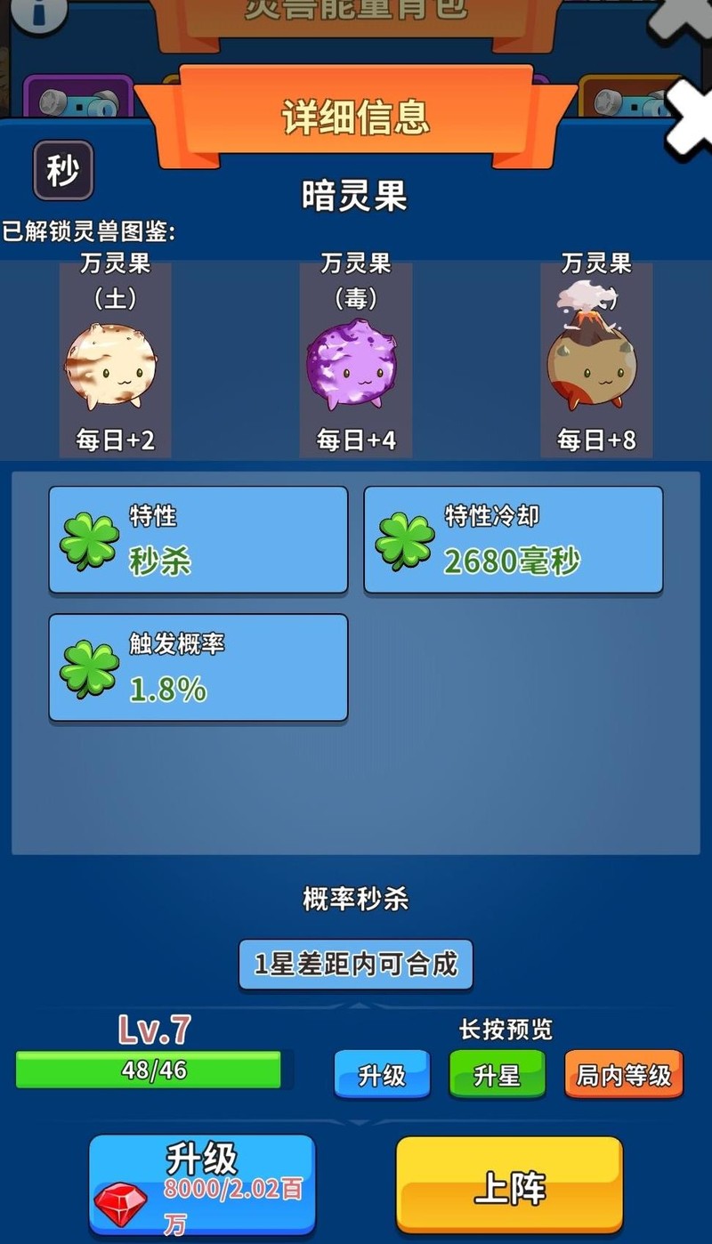 如果仅是为了解锁图鉴,至此即可结束,过程简单快捷。但若想获取更多每日固定能量,则需进一步解锁更高级的暗灵果,包括万灵果(毒)与万灵果(火)。