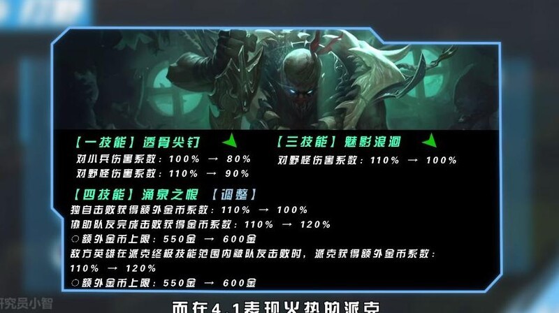 在4.1版本中表现强势的派克遭到削弱,野区效率大幅降低,排名也随之滑落至T3梯队。