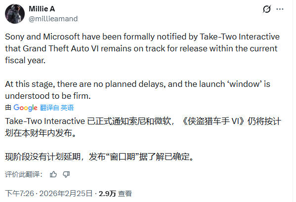 尽管玩家群体因长期等待而普遍抱有观望态度,但GTA6的发售安排已趋于明朗。据业内消息人士Millie A透露,发行商Take-Two Interactive已正式致函索尼与微软,确认游戏仍将按既定时间窗口推出,目前不存在调整计划。