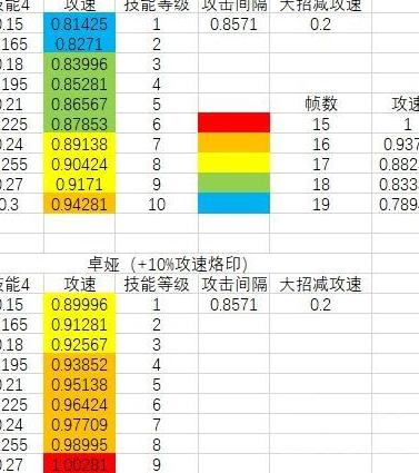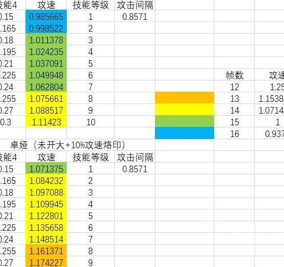 卓娅携带攻速符文时,四技能在一级、四级、九级分别对应17、16、15帧的攻击间隔。