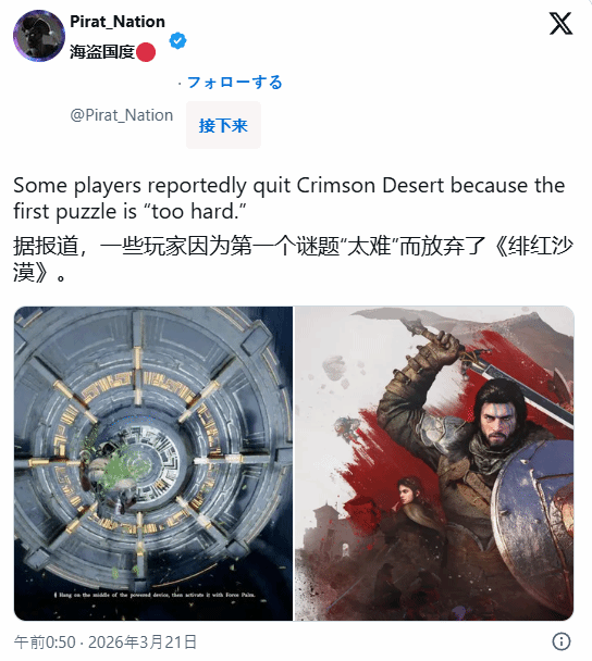 珍珠游戏于2026年3月20日推出的全新作品红色沙漠,近日在海外玩家群体中引发广泛讨论。部分玩家反馈,游戏开场不久即遭遇首个谜题,因解谜逻辑隐晦、操作指引模糊,导致大量玩家尚未深入体验便选择中止游玩。该现象迅速成为社区热议焦点。