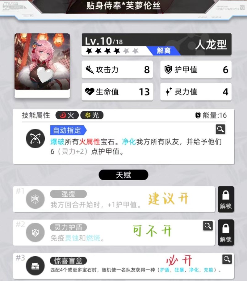 四动侍奉,充能辅助,关键在于开启核心天赋后,配合光醒皇高频四消技能,为队友提供强力增益:护盾(顶级容错)和净化(净化效果显著,可解除离玖自身的沉默,实战中触发频繁,使离玖常驻满能量,随时释放技能)。