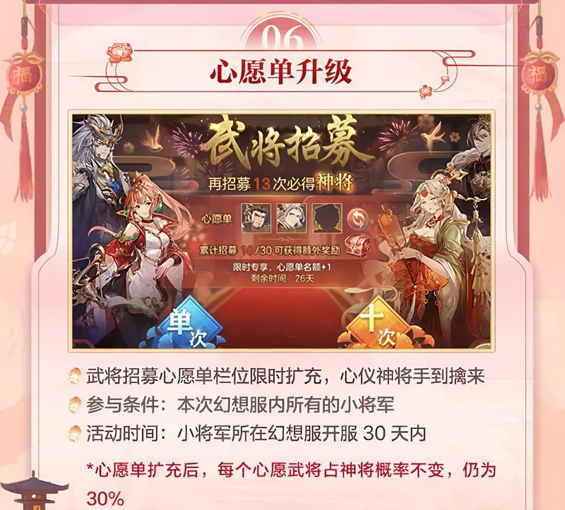 幻想服开服30天内心愿栏位增加1个,共可选3名武将,以下为抽取推荐。
