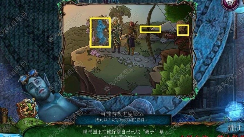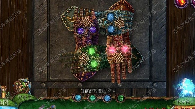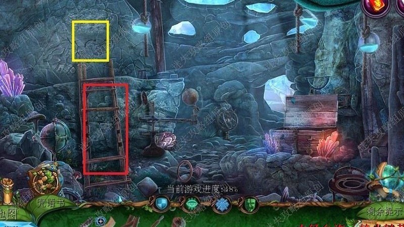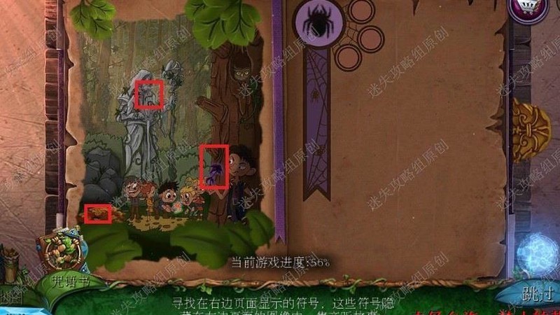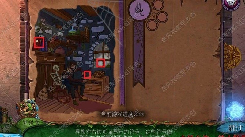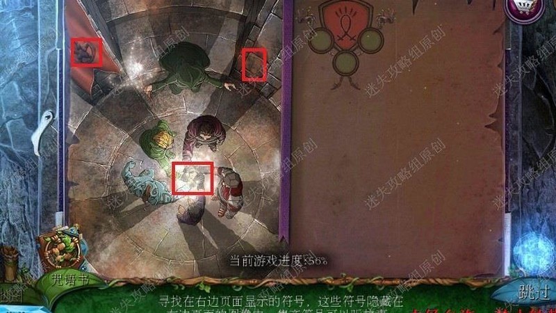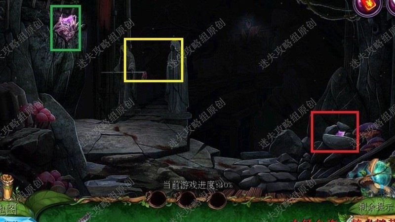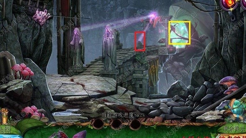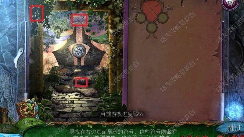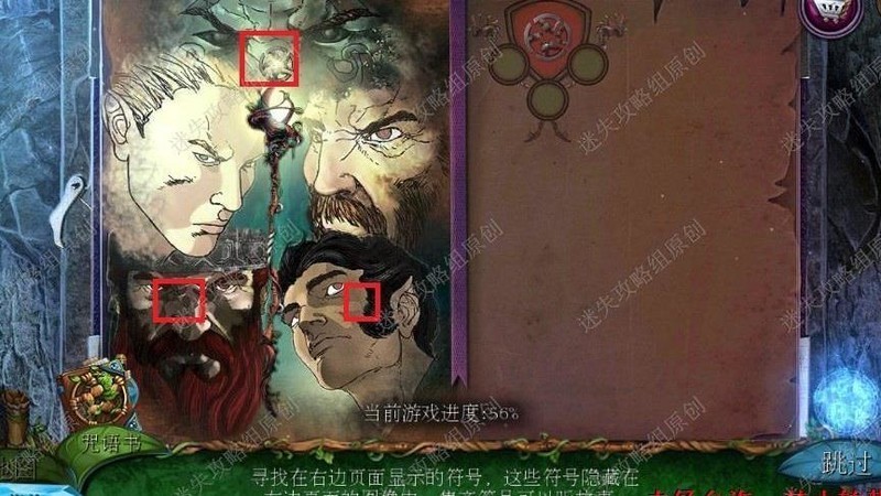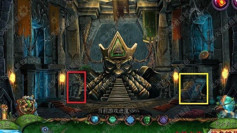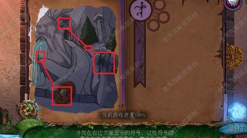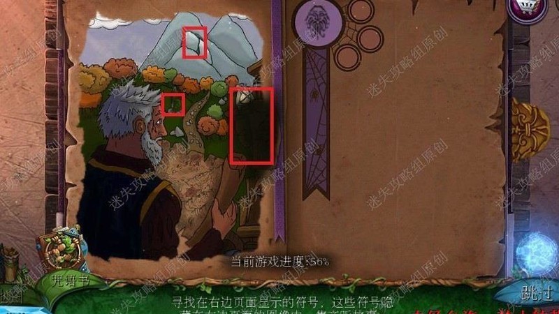在红圈处安装三块木板,点击黄圈,用干净的纸触碰墙壁以开启传送门。前往寻找祭司,交付森林地图,触发剧情后与祭司互动进入小游戏,成功完成后即可获知权杖所在位置。