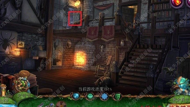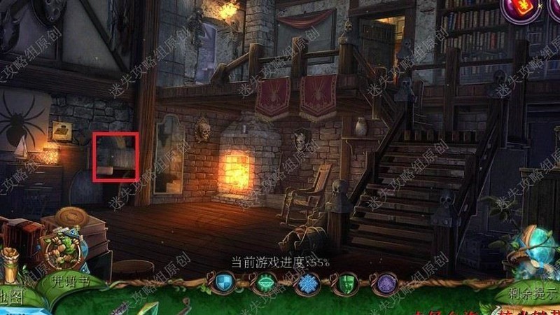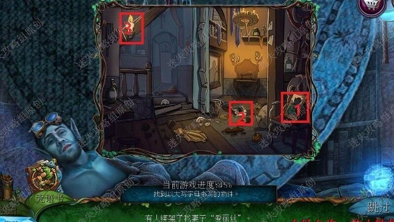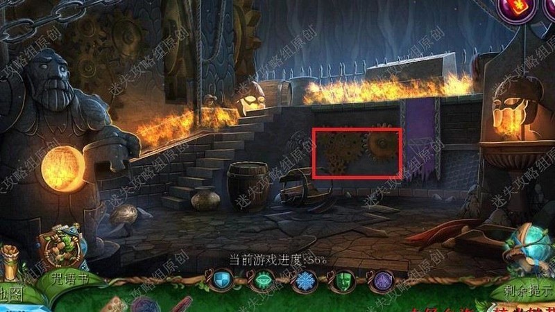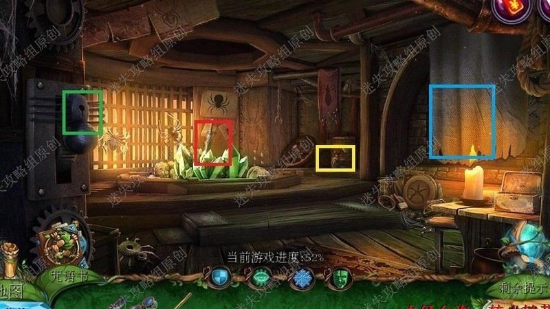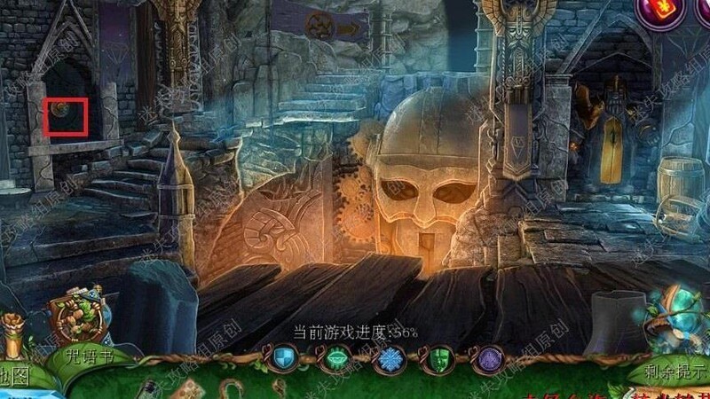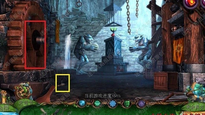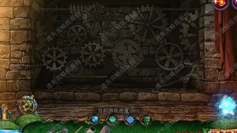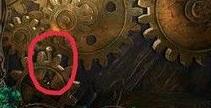 点击红圈区域,获取布料及大把手(位于椅子上方)。前往哥布林房间,在房间后方的瀑布处使用布料,获得湿衣服。返回人类房间,将湿衣服用于黄色标记画作下方的石板,观察其发光顺序,并按从左至右的31452顺序点击,取得苹果。接着点击绿圈区域,先触碰蛛网使蜘蛛出现,再将苹果给予蜘蛛,获得小把手。随后点击黄圈位置,将大小把手安装到钟表上,启动后可取得第二个齿轮。