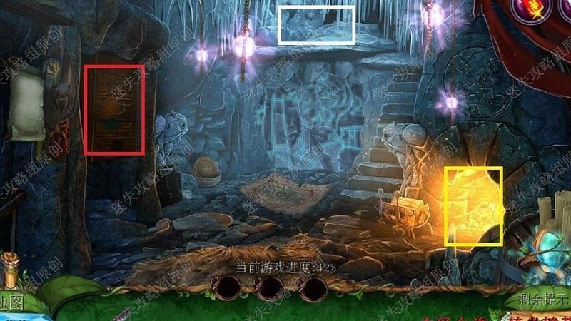 点击红圈区域,在左侧晃动旗帜的麻袋破口处点击,拾取钻石。返回祭祀洞穴(即祭祀救人所在的房间),点击祭坛后方的冰块,用钻石划开冰层,取得红色金属手套。接着前往祭祀房间,点击黄色标记处,佩戴红色金属手套作用于茶壶把手,获得水壶。点击白色标记处,用水壶接水,得到冰块及冰块左侧的人手形状嵌件。再次点击黄色标记,将冰块放入其中,获得精灵手形嵌件。