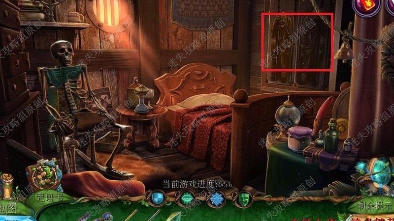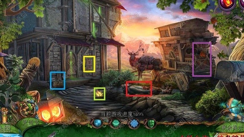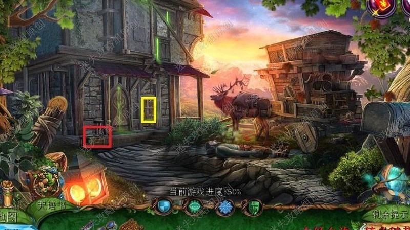 前往马车,红圈处放入两把剑获取符文。点击咒语书完成符文制作(红色药水)。出马车对鹿使用符文,获得曲柄,并领悟反派败于多言。随后进入左侧房屋。