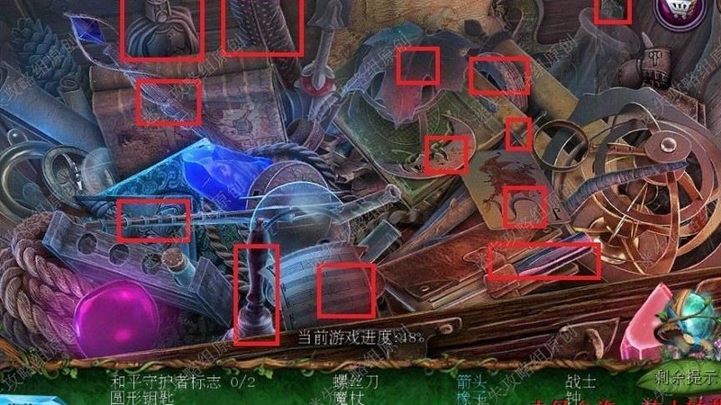从左侧麻袋取得小刀,用于右上方红色宝石,获得红心宝石。将红心宝石嵌入中间偏右的心形凹槽,补全后左侧出现钥匙和紫色水晶。