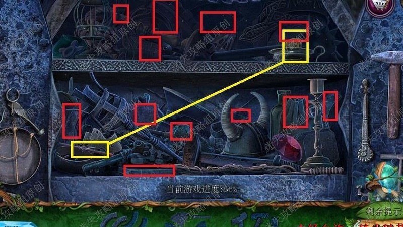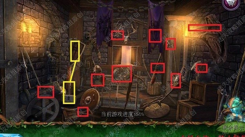 进入矮人房间,点击红圈区域,在左上角火炬处使用镰刀权杖获取连接器(1)。点击黄圈位置,从底部取得起重器把手。随后前往哥布林房间,将地面箱子移至右侧,点击上方隔板获得钳子与另一连接器。再点击铁链,安装连接器后得到带镣铐的链子。