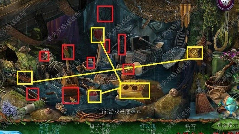 点击红圈获取泳镜,绿圈取得咒语符文,黄圈在窗台处拿到小刀把手。蓝圈处装上把手获得生锈的刀,再用刀割断紫圈的绳子,即可进入小游戏环节。
