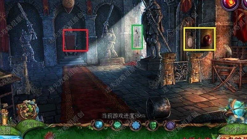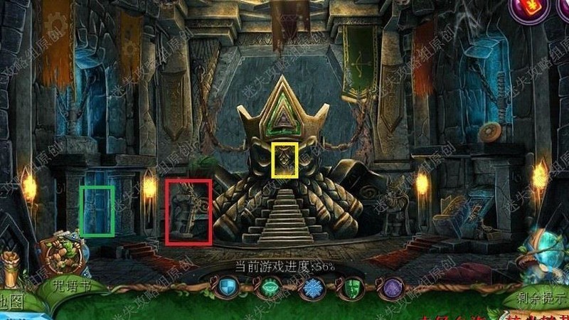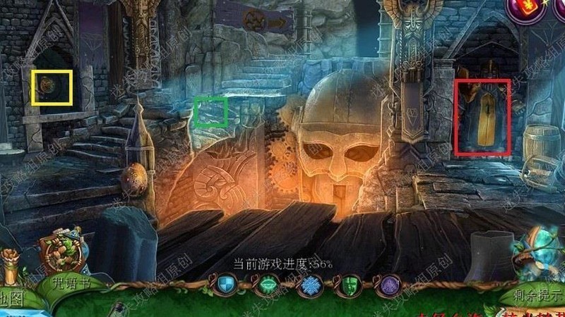 点击红圈触发陷阱后,转而点击黄圈获取金属锉。返回马车处,用金属锉处理骷髅,获得水龙头阀和金钥匙。再次进入机关房间,将阀门安装在黄色接口上,开启后取得焦油。使用金钥匙激活绿圈,随后点击蓝圈进入小游戏。进入前先点击场景拾取一块干净的布。完成小游戏任务后,重新点击绿圈解除陷阱。回到马车,将焦油涂抹在骷髅脊椎位置,再用干净的布擦拭,获得三个神秘符号。将这三个符号依次对应输入红圈内的图案,最终取得符文、银剑与绿宝石。
