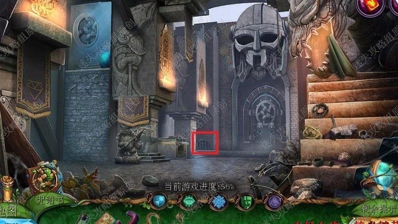 点击红圈,将锤柄放入红圈获得锤子,取走锤子后点击阴影区域取得金属手套。使用金属手套点击黄圈获取弓箭部件。点击蓝圈,放入弓箭部件,先拼合掉落的碎片,再装入锤子,即可开启大门并进入。