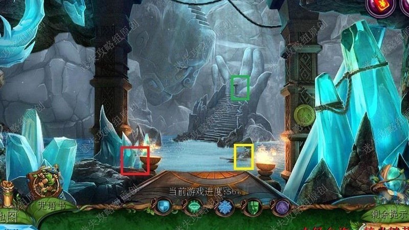 进入大厅后,先用冰冻咒语冻结湖面。在红圈位置点击,获取两条皮带、撬棍和密码盒。用撬棍作用于黄圈区域,取得木块,再将皮带绑在木块上制成临时契子。将临时契子插入冰面裂缝,在绿圈处点击获得一个奇特的罗盘。把罗盘安装到密码盒上,依照特定顺序点击盒面符号解锁,取出银把手并安装至机关,即可触发后续的小游戏环节。