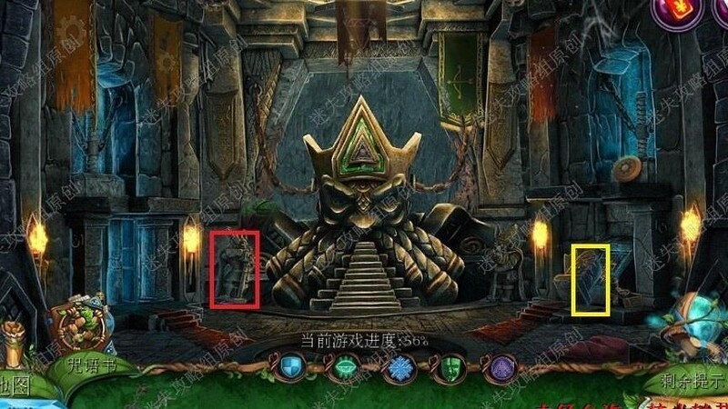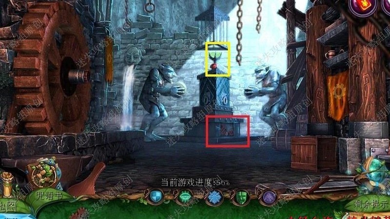进入哥布林房间,点击红圈处放入齿轮,获取黄圈内的八边形嵌入物及小矮人雕像的眼睛(1),随后前往人类房间。