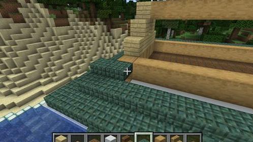 改用暗海晶石楼梯,紧贴白桦木板摆放三排,每排前端均需突出一格,与图示首排保持一致。