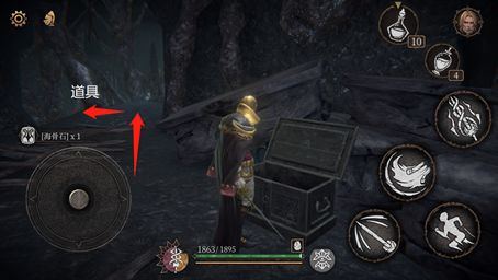 登上梯子后,可选择进入洞穴推进主线,或沿右侧小路前行开启宝箱,获取第一件物品。
