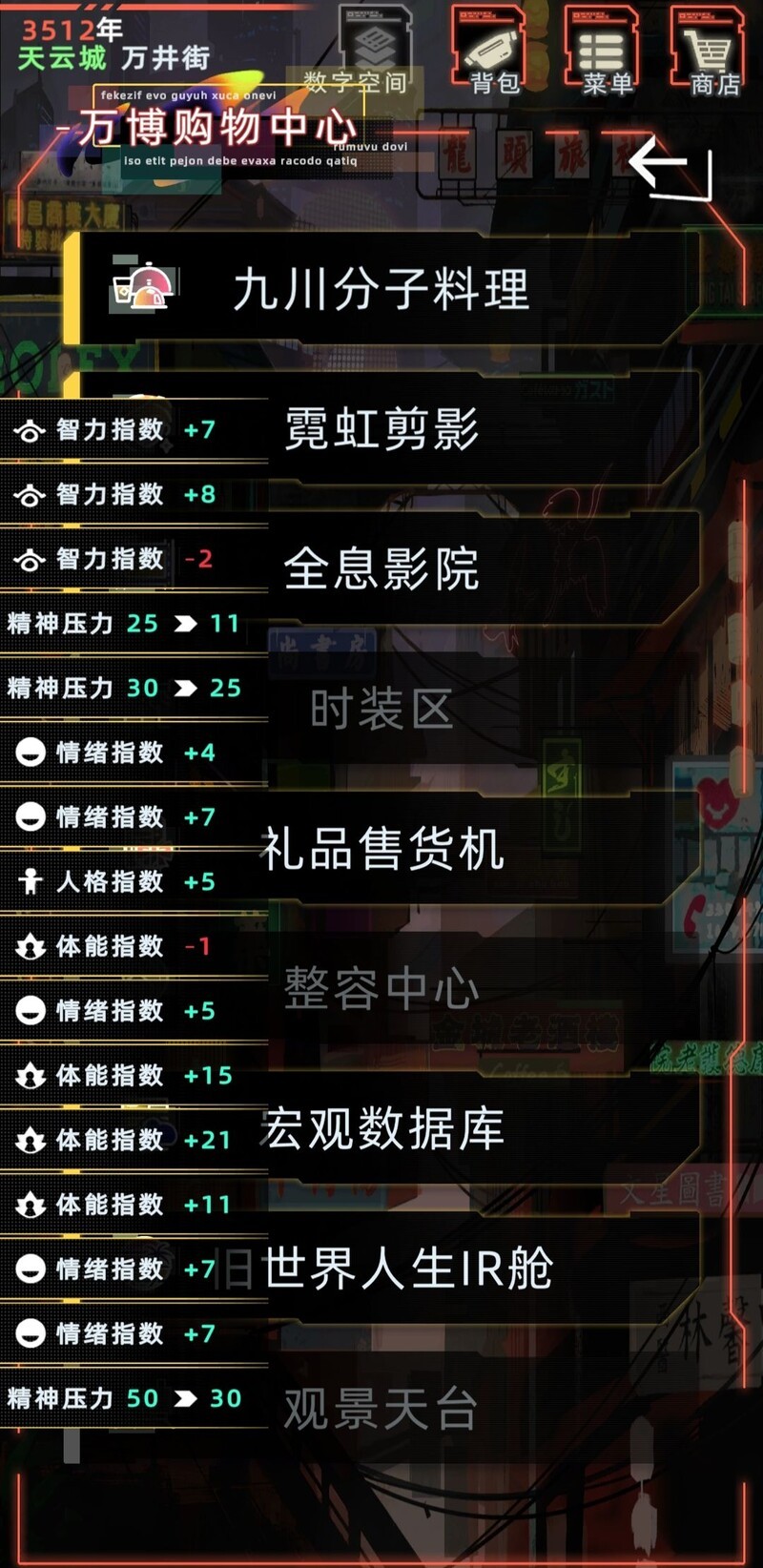全息影院有多个项目可供选择:数字骇客可大幅提升智力与情绪,同时增加压力并开发脑域;我不是DJ则提升人格但降低情绪;午夜列车增加情绪并缓解20点压力;波西米亚癔症增强社交与智力;21世纪则提升人格并增加压力。此外,料理店提供超过30道菜品,首次食用必定大幅增加体能、情绪、智力、社交与人格,后续效果依据当前数值而定,数值越低效果越明显,通常可生效两到三次。