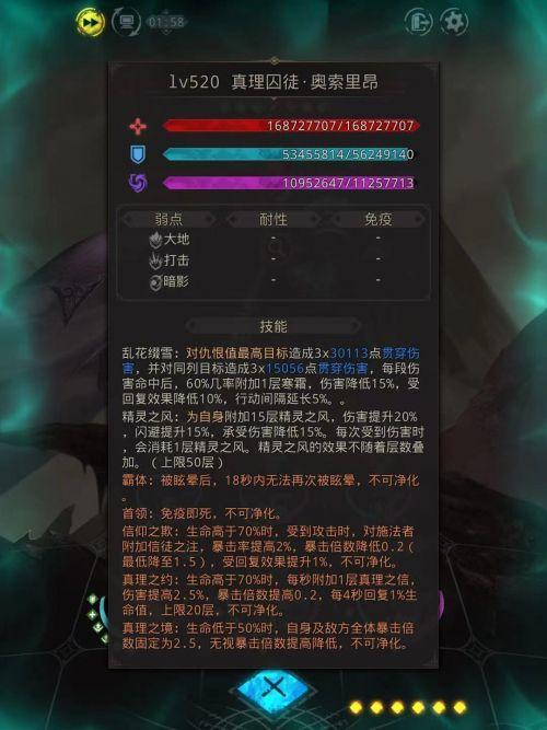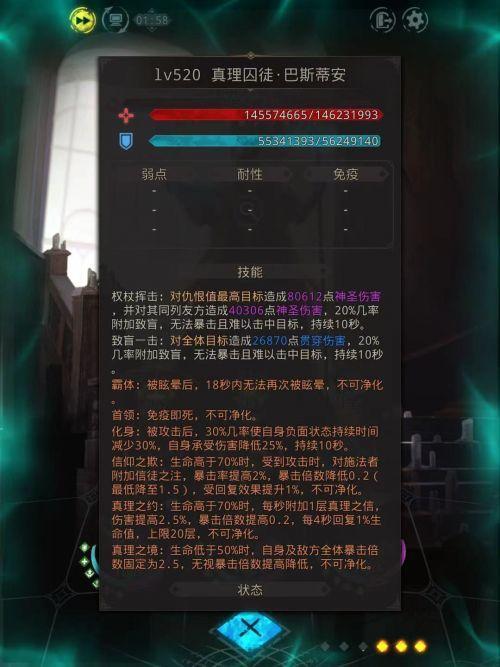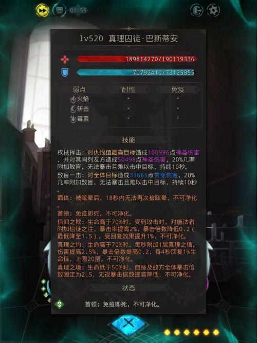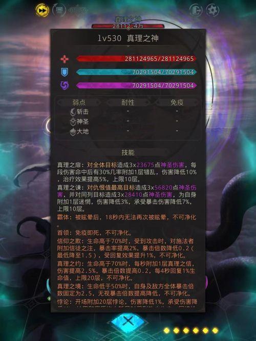 在真理之神副本中,当进入错乱状态时,会降低我方伤害并提升治疗效果,建议豪侠佩戴黎明腰带,或在甩豆前由奶妈使用吼净化我方。迷惘状态会降低我方暴击伤害,应在甩豆前由黎明先手吼净化BOSS。其他机制如生命低于50%时双方暴击倍数锁定为2.5倍。至于信仰之欺和真理之约等效果,所谓增加回复、提升自身伤害、降低我方伤害等描述实际作用有限。