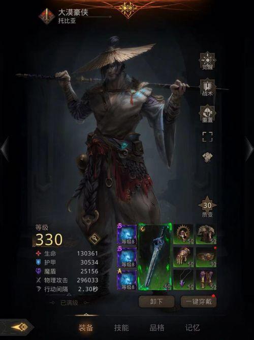 豪侠330:武器65,暴击率1,装备黎明腰带,忠诚效果降低目标抗性,战吼伤害提升45%,首领伤害加成45%,盾甲生命增益前后排伤害34%,符文狂热增伤1.5倍,技能流云19/4,天际5层,任剑技能释放,魔物伤害提升3倍,额外增加15%伤害,暴击率加2.5,攻击速度提升3%。