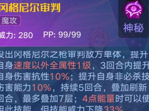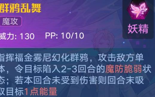 三技能为单体攻击,使目标进入魔防脆弱状态;若本回合未受伤,则在回合结束时吸取目标1点能量。魔防脆弱状态下,目标所受魔法伤害增加30%,且每回合有50%概率降低魔防等级1级。