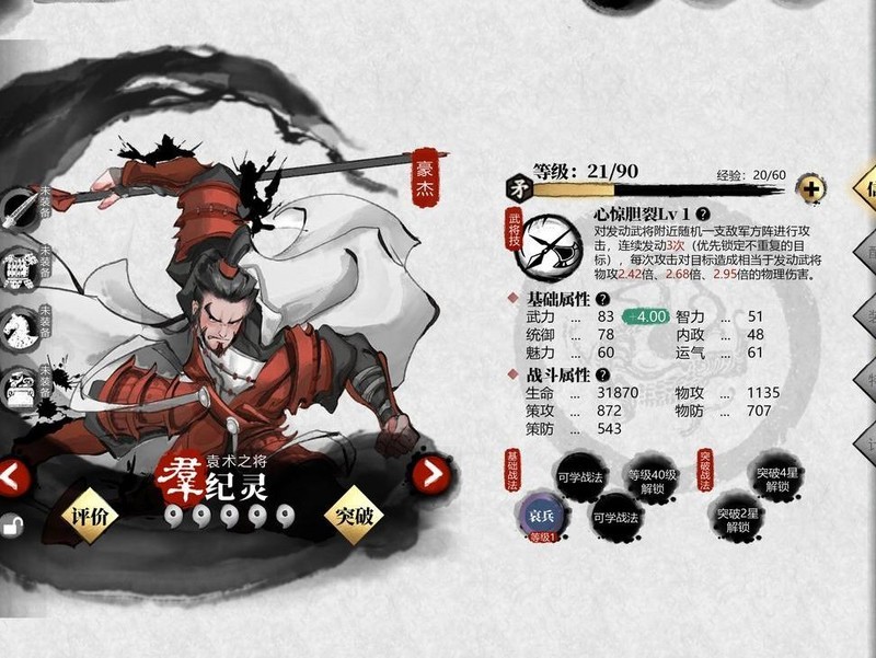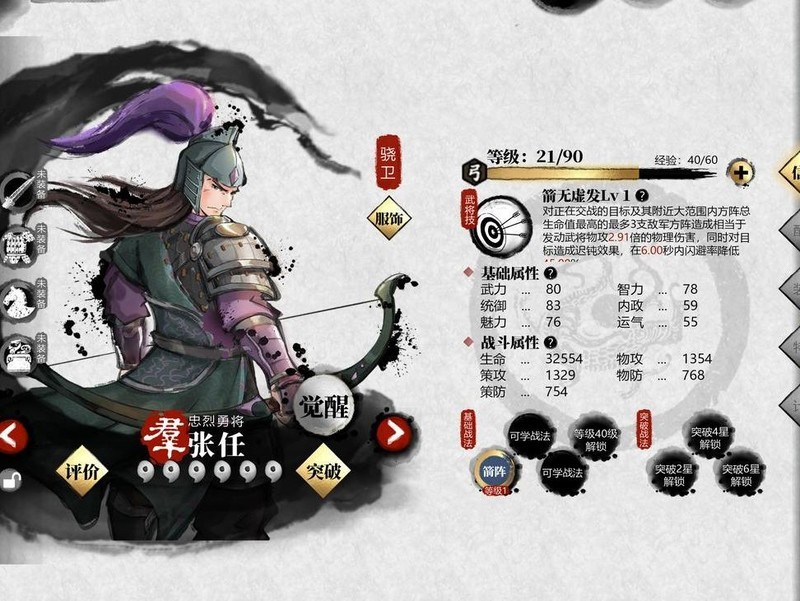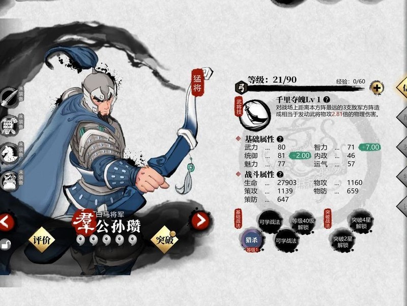 张任与公孙瓒均为21级0星弓兵将领,武力80,智力78,统御83,具体所示。