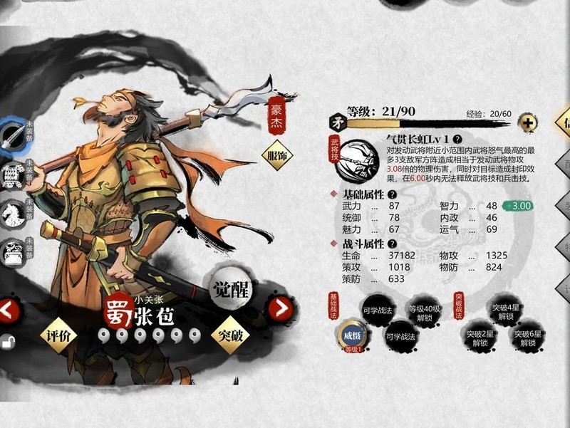 张苞与纪灵同为枪兵将领,等级21,无星,武力87,智力51,统御78,具体所示。