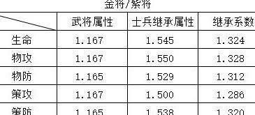 由于张苞的战斗属性比纪灵高出16.7%,将士兵继承属性比例除以武将战斗属性比例,可得士兵继承系数之比,具体数值见下表。