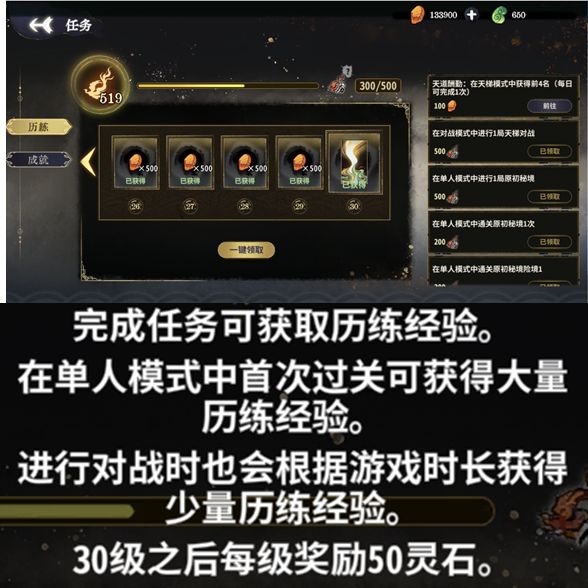 前30级战令奖励包含8000灵石、三个角色(每个3600灵石)、一个副职业(3000灵石)、一个牌背和一个头像框,总价值21800灵石。每级需500历练值解锁,共需15000历练经验才能全部获得。
