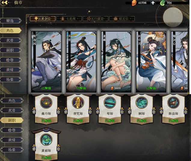 进入仙市界面后,点击角色按钮,用之前获得的3600灵石购买一个你喜欢的宝宝角色。接着选择副职按钮,再用3000灵石购买一个你喜欢的副职业。