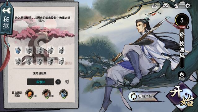 选择牧逸风作为初始角色,点击开始进入原初秘境。建议新手使用灵剑阵容,对抗AI时操作简单,核心卡牌为万法归灵剑。副职业可选炼丹师或符咒师,通过积累灵气牌获取灵气,最终释放万法归灵剑战胜对手。