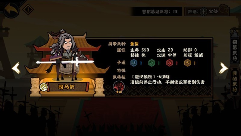 在三国之外的无争道剧本中,司马懿作用不大,6点谋略值还没攒够战争就结束了,最关键的四项属性也失去意义。不过,若使用仪仗剑或武器,司马懿的四项属性仍有一定价值。