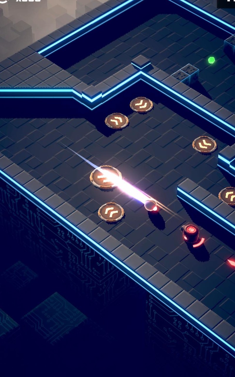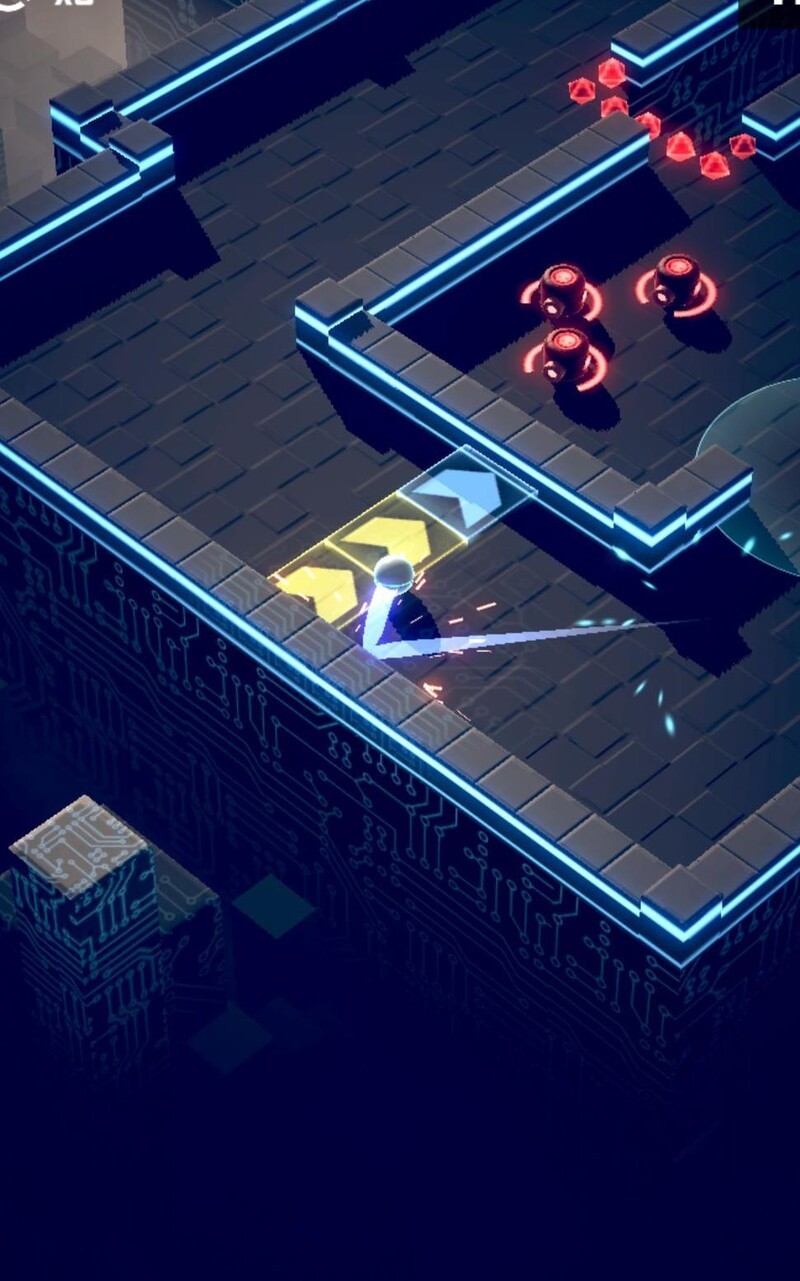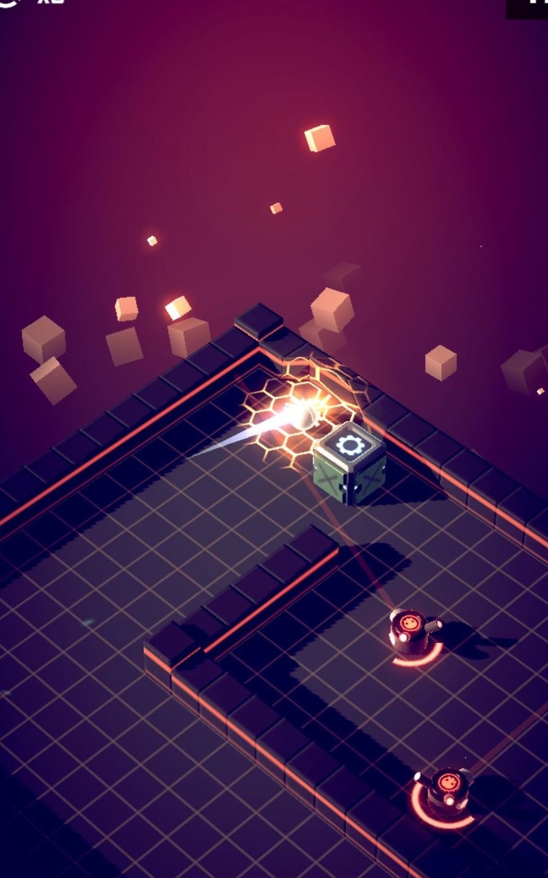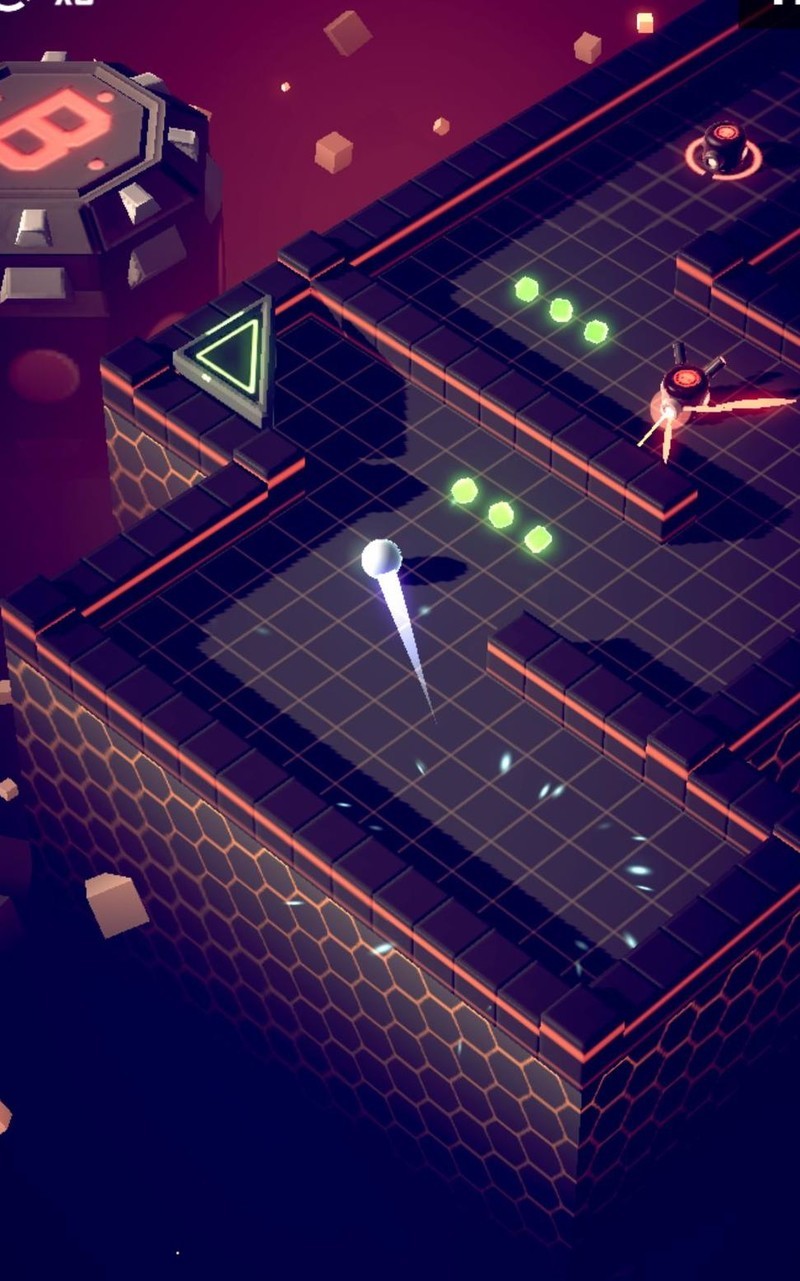 所示,画面中央呈豆腐渣状的墙体为可破坏结构,小球撞击核心一次后即会碎裂。若未处于加速状态,碰撞时会被弹回;开启加速则能直接穿透。墙体后方藏有首类攻击型敌人,其周围出现读条圈,读条完成后会瞄准小球当前位置发射一枚子弹,此为单发形态。后续还将出现三连发、三向散射、无读条持续扫射的加特林模式以及多方向齐射炮台等多种变体,各类敌人的读条速度亦不相同,需仔细观察其节奏后再推进。