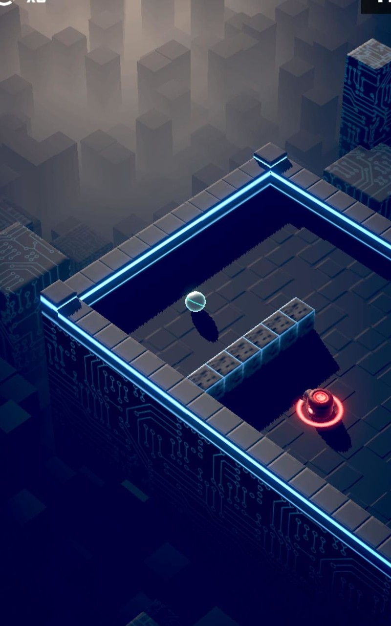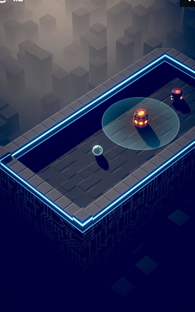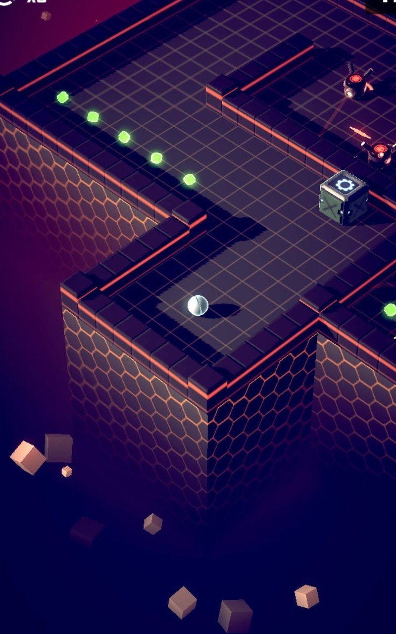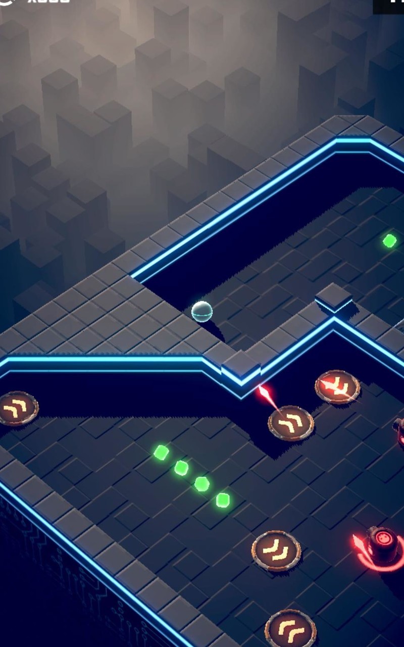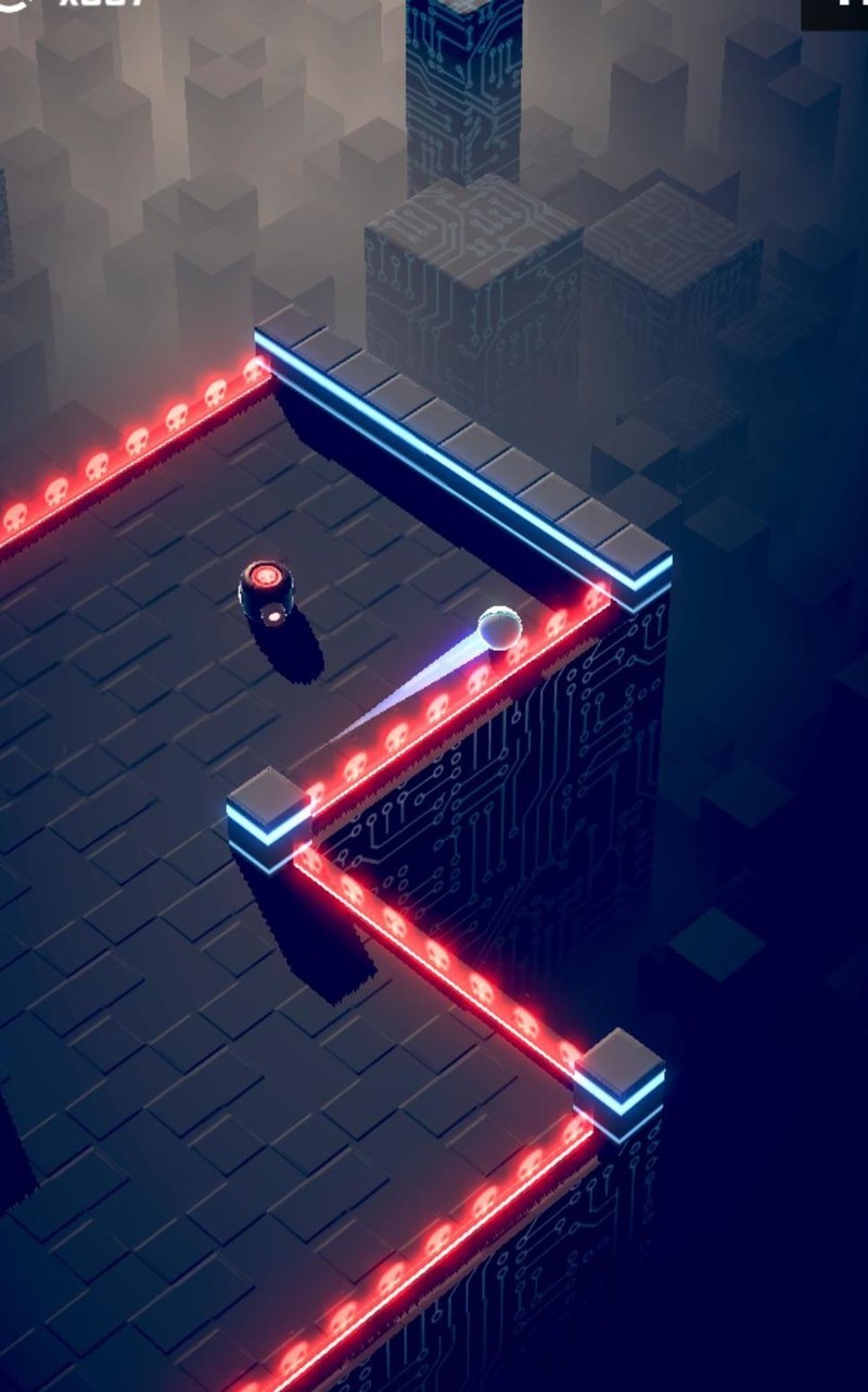 所示,画面中央呈豆腐渣状的墙体为可破坏结构,小球撞击核心一次后即会碎裂。若未处于加速状态,碰撞时会被弹回;开启加速则能直接穿透。墙体后方藏有首类攻击型敌人,其周围出现读条圈,读条完成后会瞄准小球当前位置发射一枚子弹,此为单发形态。后续还将出现三连发、三向散射、无读条持续扫射的加特林模式以及多方向齐射炮台等多种变体,各类敌人的读条速度亦不相同,需仔细观察其节奏后再推进。