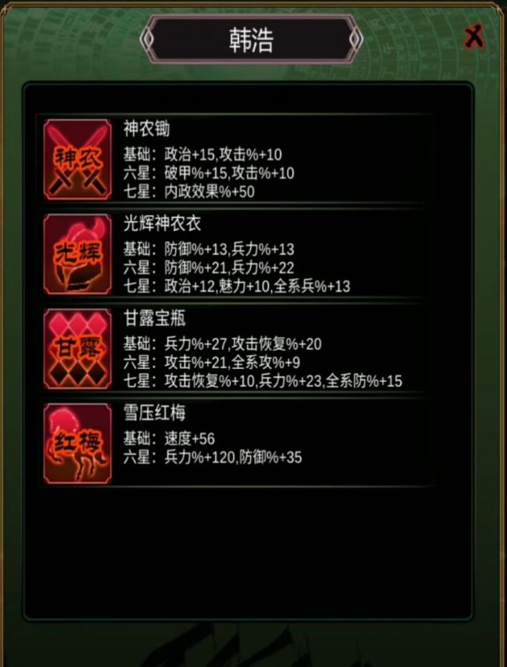 今日主角乃屯田制开创者,为曹魏政权奠定后勤根基,执掌禁军的万岁亭侯韩浩,字元嗣。他所代表的内政型弓兵武将,在拥有神农锄、光辉神农衣、甘露宝瓶与血压红梅等核心装备后,即可成为当前版本中最顶尖的内政主力之一,堪称体系完备、功效卓著。