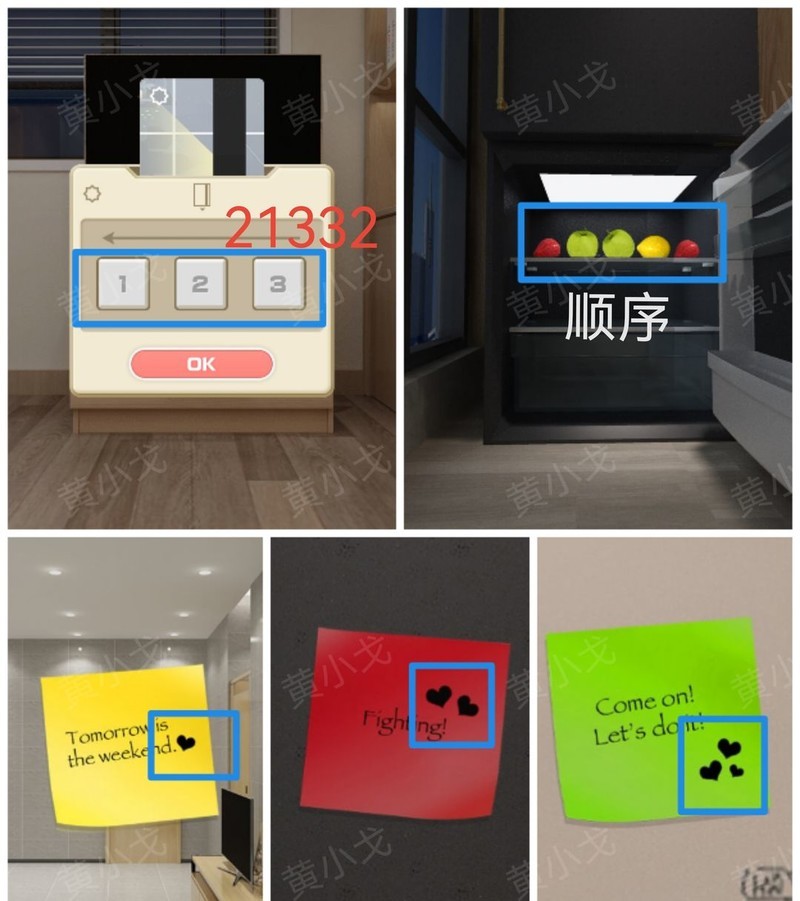 根据场景中便利贴的颜色与爱心数量,对照冰箱内水果的颜色及排列顺序,依次点击密码锁上的数字按钮。