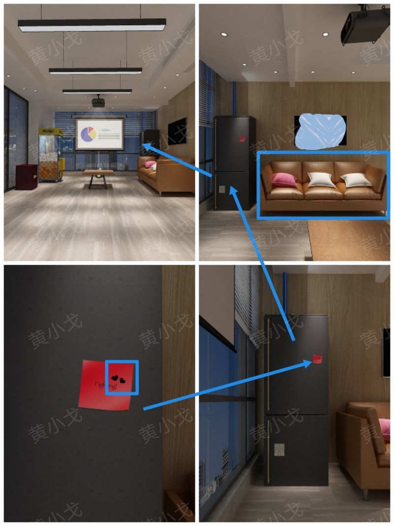 点击冰箱查看便利贴,获取关键线索信息。