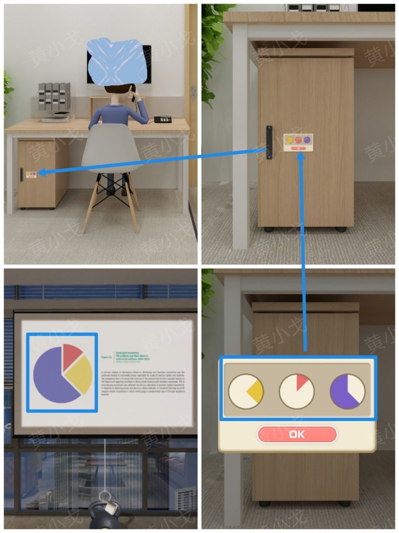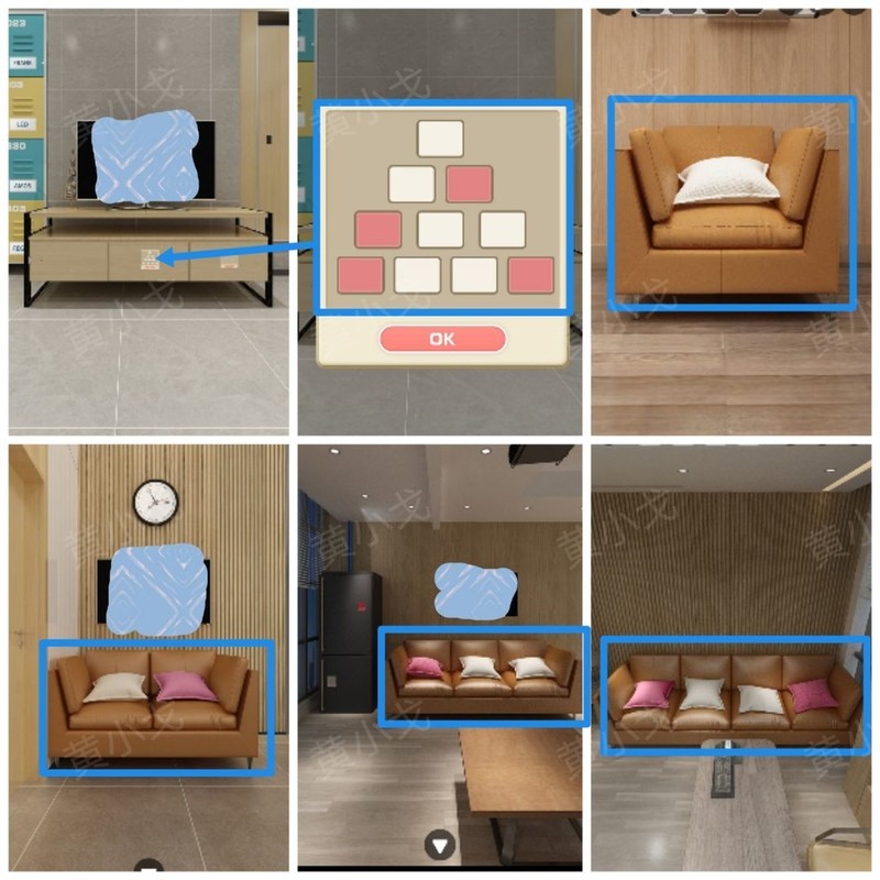 点击柜子中间抽屉的密码锁,依据各场景沙发抱枕的数量与颜色,正确调整密码锁。