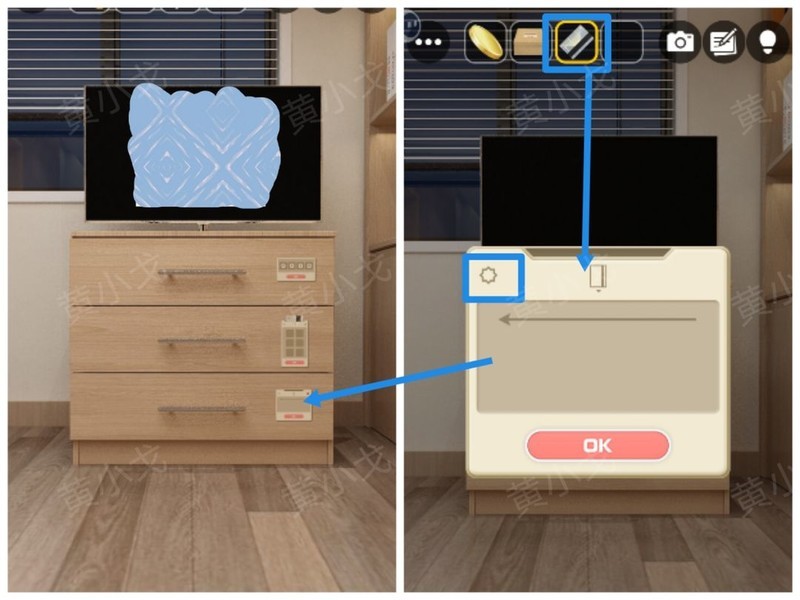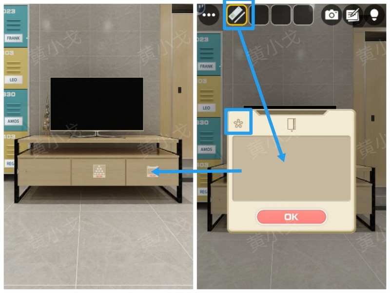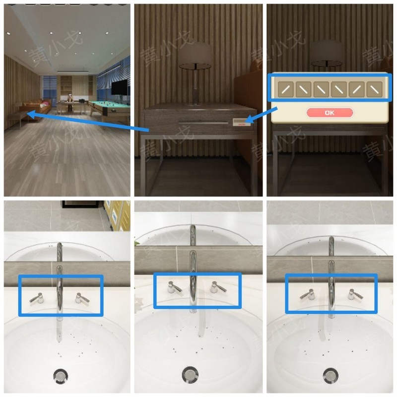 点击柜子抽屉的密码锁,依照水龙头阀门的方向提示,正确调整密码锁的组合。