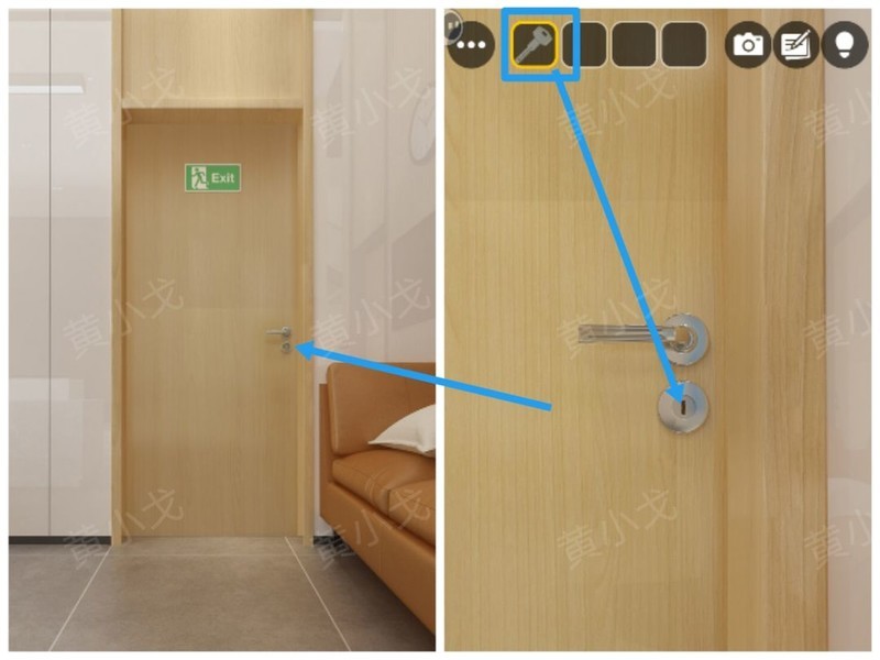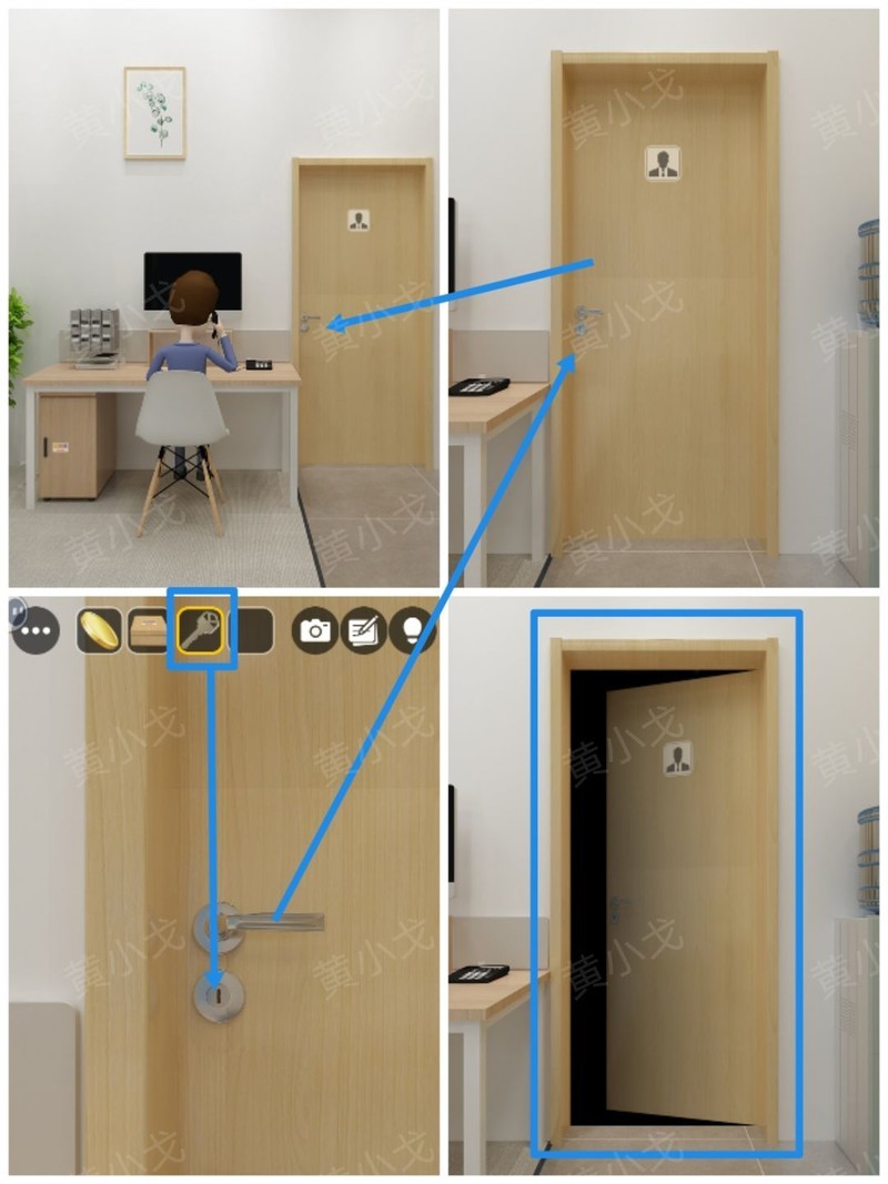 点击老板办公室的门,使用钥匙开启并进入室内。