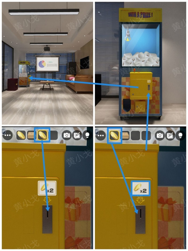 点击抓娃娃机,按提示投入两枚硬币即可开始游戏。