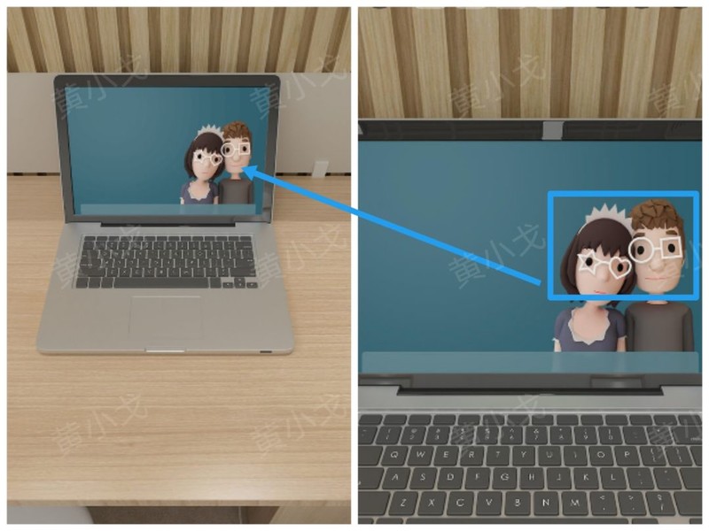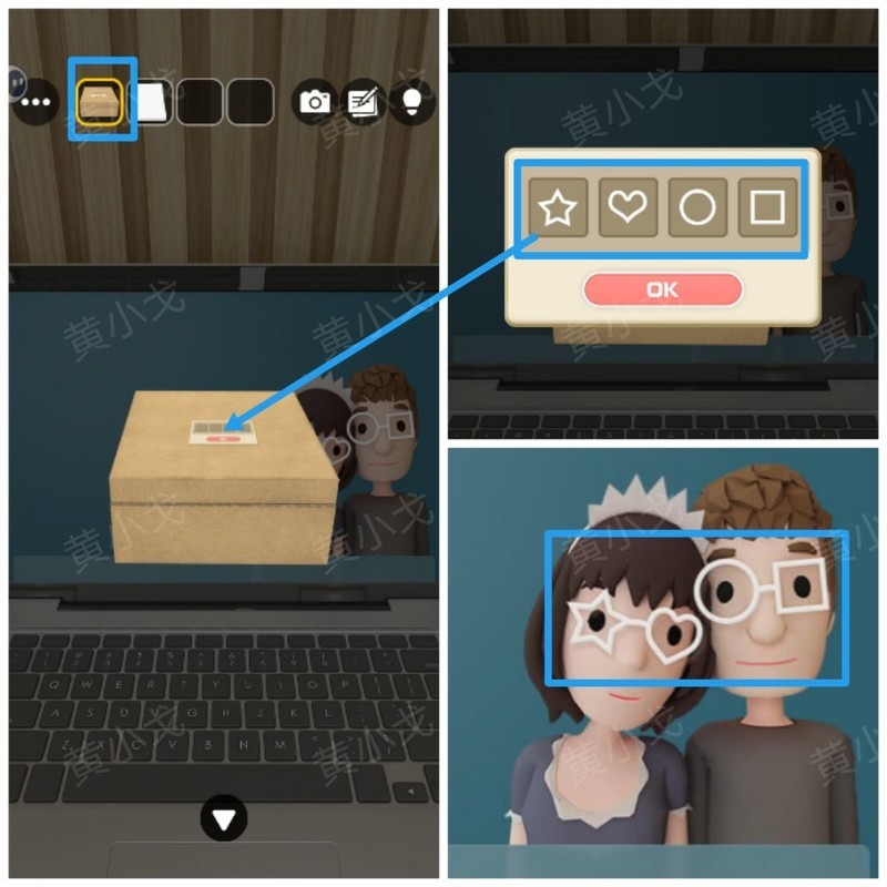 打开盒子特写,按屏保中人物眼镜框的形状顺序调整密码锁。