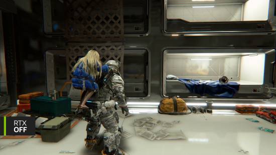 然而,实际呈现效果引发诸多质疑。对比图显示,开启RTX后,画面整体层次减弱,明暗对比趋于平缓,色调偏灰偏白,部分场景甚至呈现出失真与不协调的观感。原本精心构建的空间站环境,在技术介入后反而丧失了原有的沉浸氛围,美术设定的张力与统一性明显被削弱。