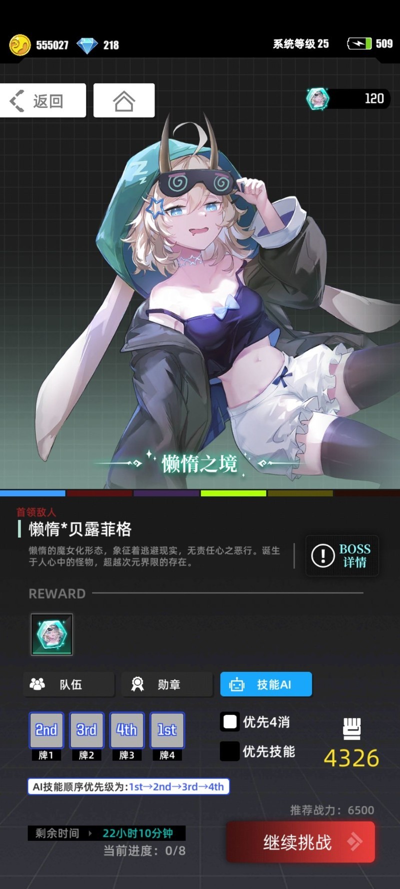 这套阵容对付懒惰通常三轮就能结束战斗,充能充足,有控制技能不怕被连击致死,如果止境开了二天赋一般不会阵亡。