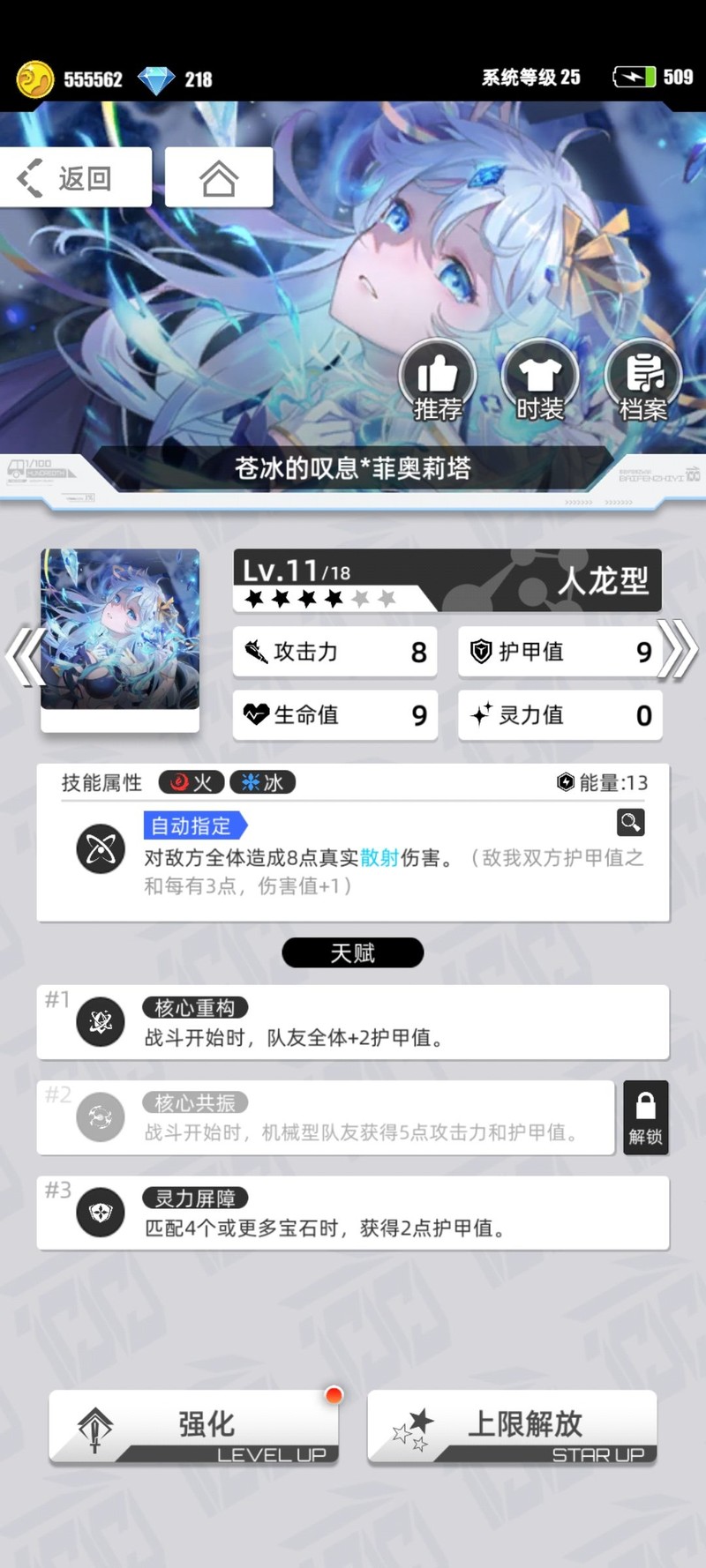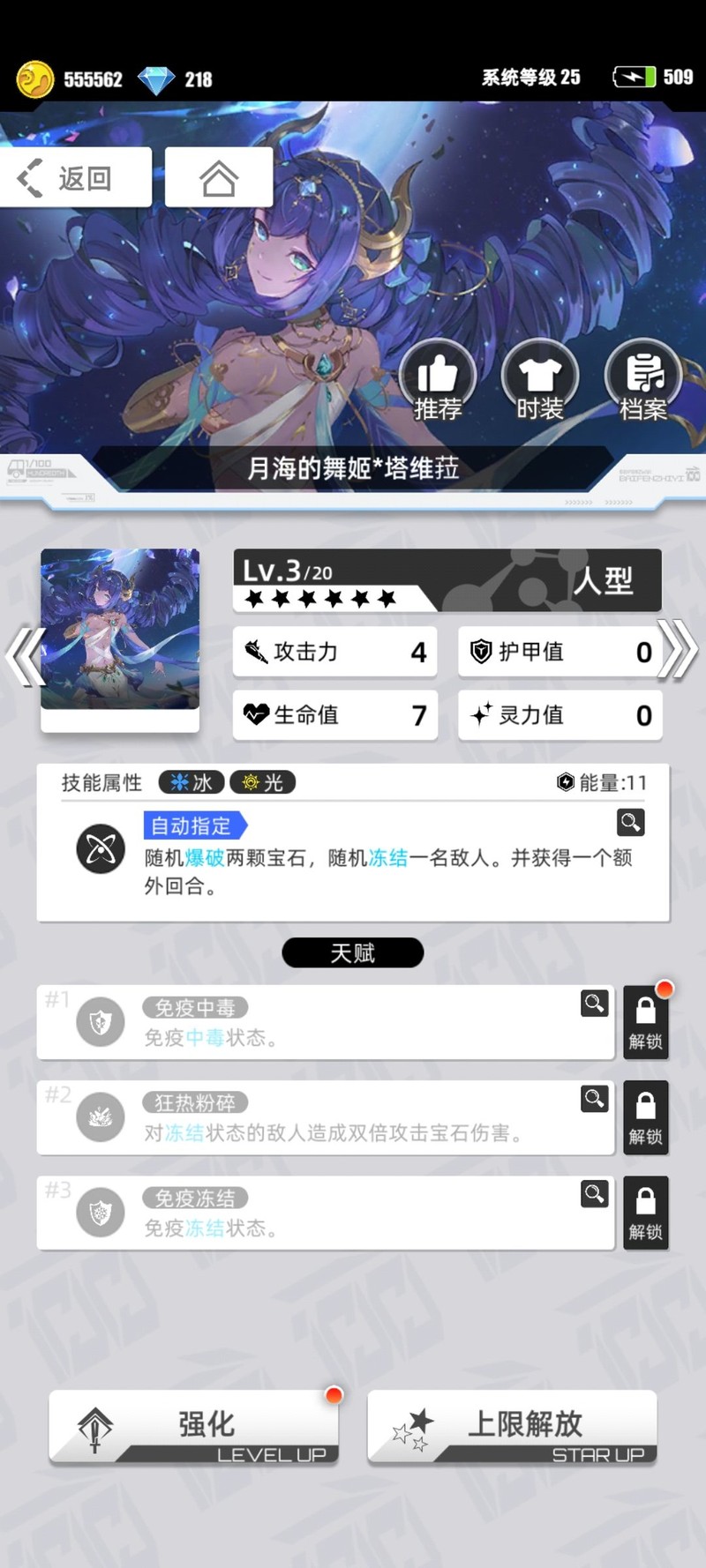 四号位苍冰,主力输出,改造前潜力巨大,改造后为冰芙,建议开启天赋3,有条件可顺带开启天赋1。